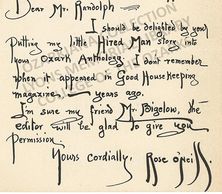 The Ozarkiana Collection contains various items related to Rose O'Neill. These include images, documents, as well as hand-written and illustrated correspondence. The majority of this correspondence is between Rose or her sister, Callista, and Vance Randolph.